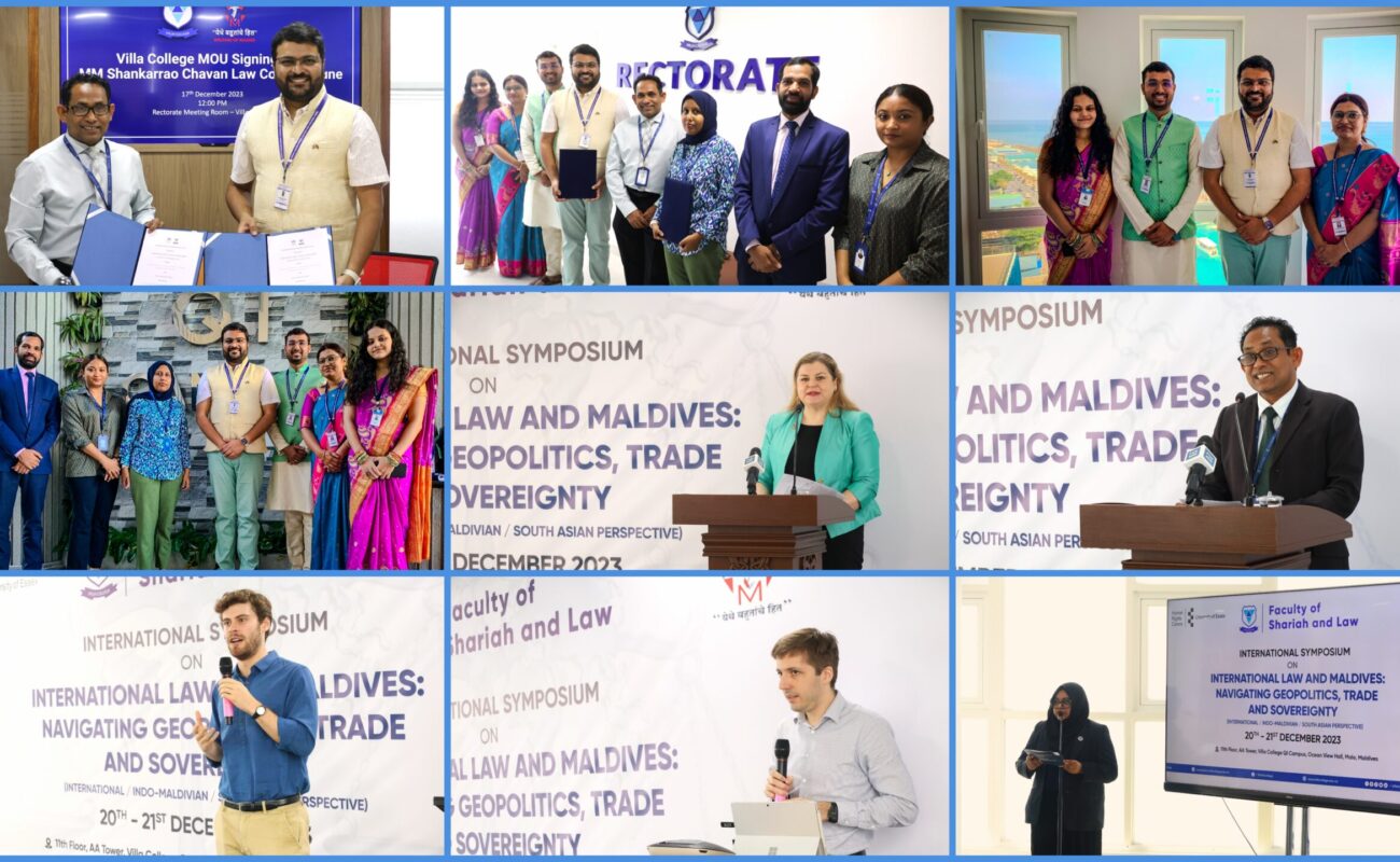 1. Villa College, MALDIVES & University of Essex, UNITED KINGDOM 20th – 21st December, 2023 International Symposium on ‘International Law And Maldives: Navigating Geopolitics, Trade And Sovereignty 11th Floor, AA Tower, Villa College QI Campus, Ocean View Hall, Male’, Maldives No. of Participants: 80